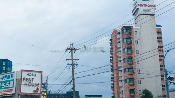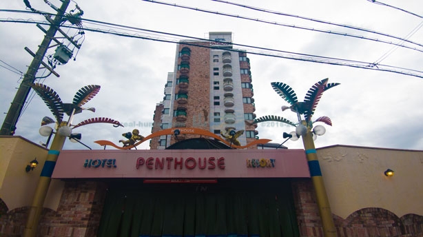 その交差点の奥にそびえたつ建物、こちらラブホです。ペントハウスという名のホテル。ペントハウスとは最上階の部屋を指す言葉ですが私にはアメリカのエロ本のイメージしかありません。