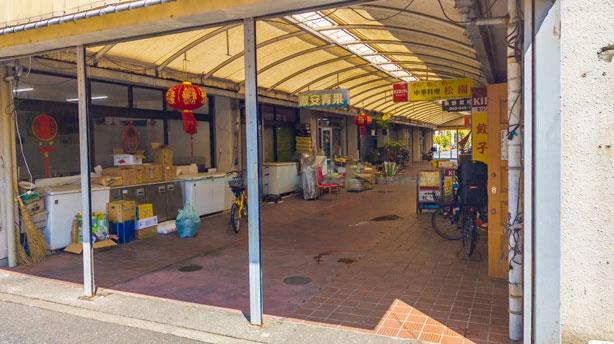 アーケード街の向かい側。こちらも中華飯店があります。ぜんぜん日本じゃない感じ。右上にひらがなが見えますが日本語の塾でした。