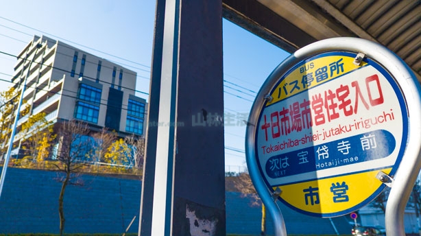 こちらに十日市場市営住宅バス停があります。十日市場住宅自体はすでに残っていませんがここに団地があったと証明できるバス停。