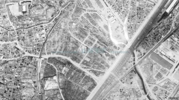 こちらは当時の衛星写真ですがかろうじて道が分かる程度。建物全てが焼失しています。