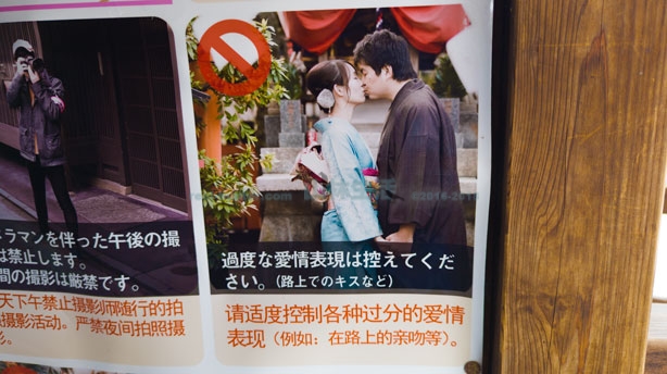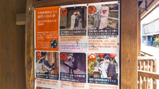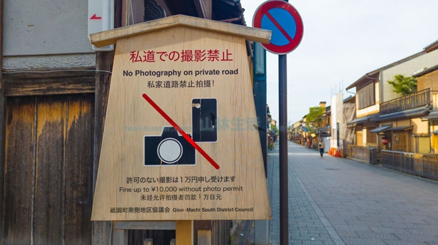 花見小路は公道ですが脇の路地は私道です。外国人観光客が増えたためこの標識を掲げたそうです。また立入禁止にしたエリアもあるそうです。