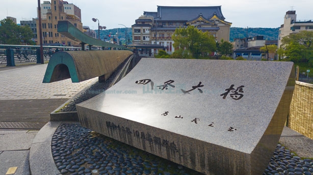 四条通沿いの鴨川を渡るための橋で、四条大橋は1142年にはじめて架けられ、現在の橋は1942年に新設されました。この橋を渡り東へ進むと八坂神社に行けその界隈が祇園と呼ばれるところです。