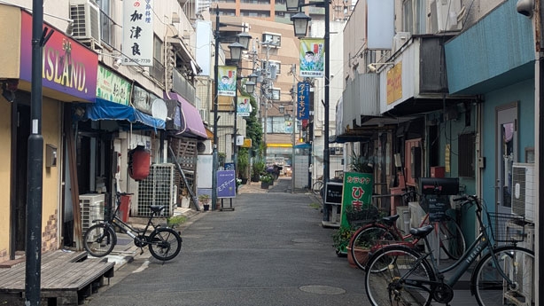 スナックやパブが軒を連ねる横丁があります。雰囲気は昭和のスナック街のようなところ。