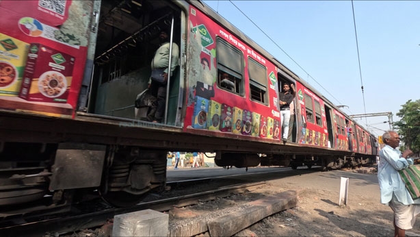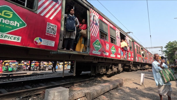 インドが汚い原因の電車が通ります。まさかのラッピング電車。そのラッピング電車も若干きたなめ。